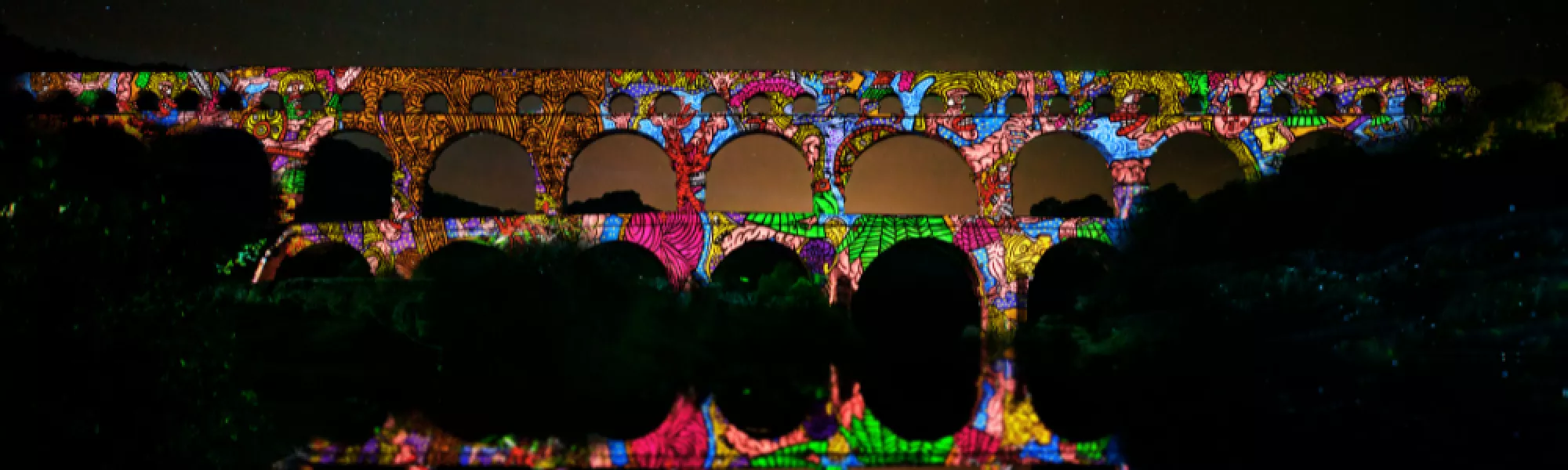 À la nuit tombée, le Pont se métamorphose en un immense tableau vivant de 275 mètres. Pour 2026, le spectacle de vidéo-mapping s’inspire de la Figuration Libre et de l’univers de Combas : ses personnages, ses lignes et ses couleurs vibrantes prennent vie sur les arches antiques.